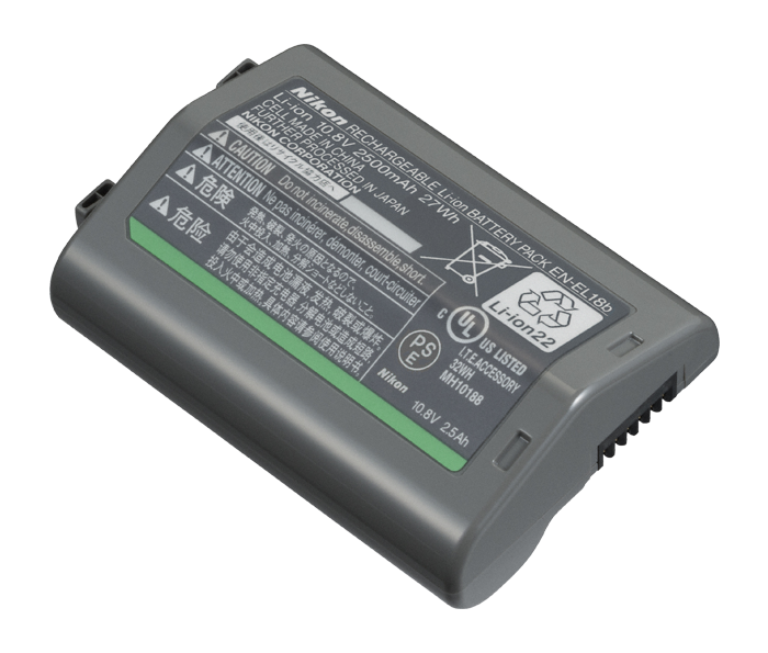 The EN-EL18b Rechargeable Lithium-ion Battery is used with select Nikon DSLRs and Multi-Power Battery Packs, powering the cameras.