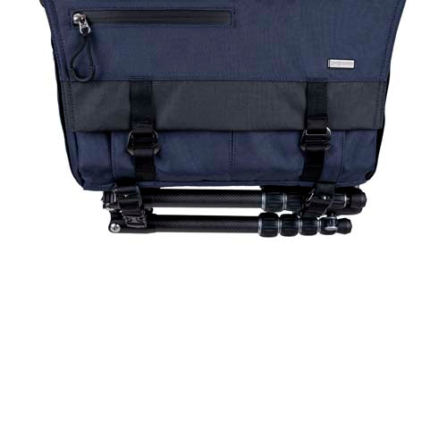 A tripod harness can be found on the bottom of the Jasper Satchel. The tripod harness uses quick release buckles for fast removal or insertion of the tripod. With the bag's shoulder strap attached "courier style" you can sling the satchel behind your back and carry a compact tripod (like a ProMaster XC-M 522) quite well. The tripod harness can be removed from the bag when you prefer not to use it.
