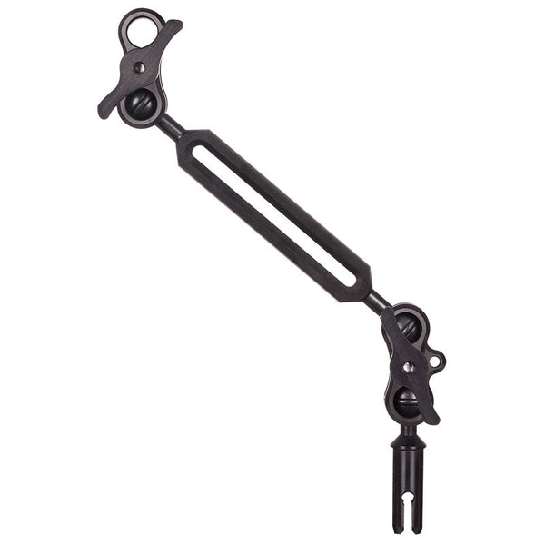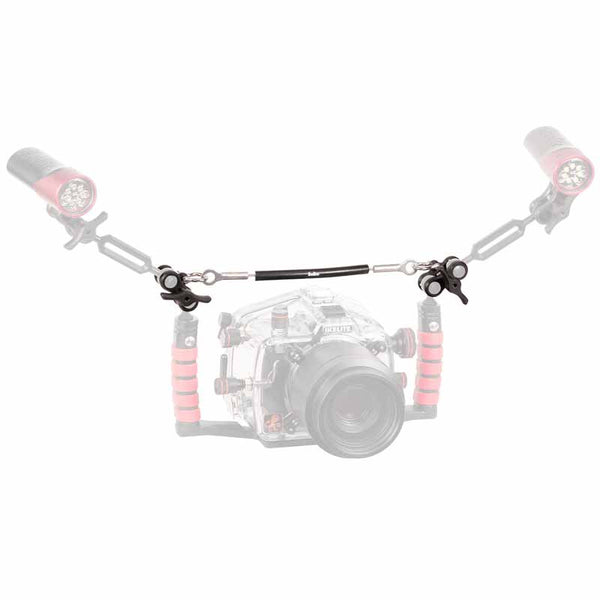 Span your dual tray and arm system with this versatile top handle. The unique slotted ball arm doubles as both a handle and a mounting location for additional lighting, or a 67mm threaded lens holder. Works with dual trays for Compact Digital or DSLR housings with two lighting arms attached.