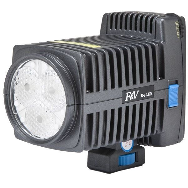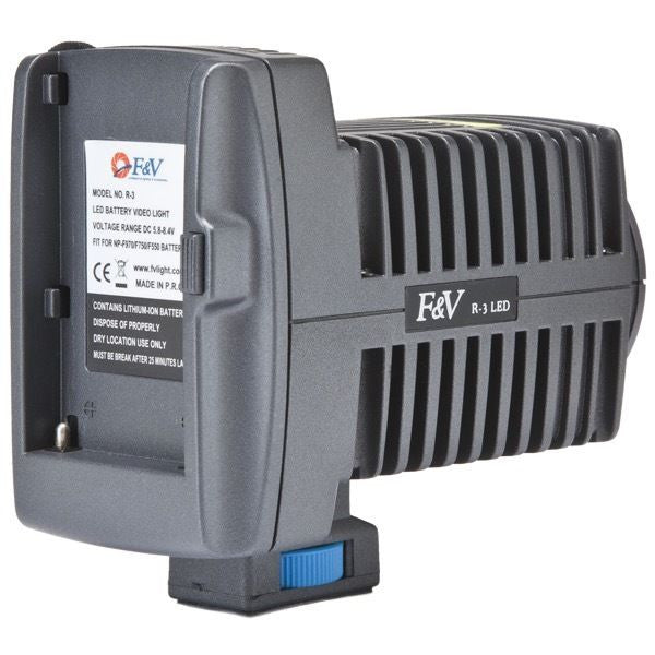 This R-3 model comes with a Sony NP-F battery plate. This light has a standard cold shoe mount that has an integrated 1/4"-20 female thread. The addition of the 1/4"-20 female thread allows for the attachment of mounting accessories such as a Baby Pin, Spigot, or Hand Grip.