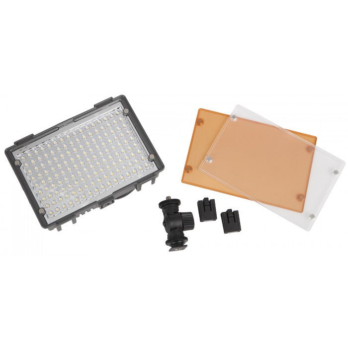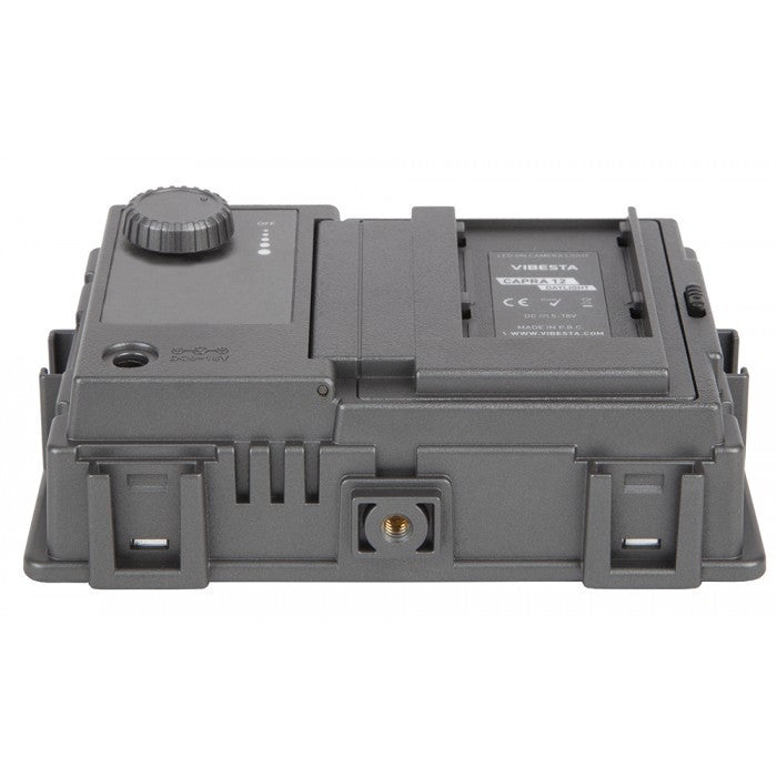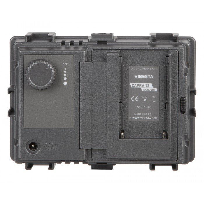 The Capra 12 is a fully featured, on-camera light with 144 powerful LEDs and a high CRI of 85. The unit comes in both a daylight and bi-color model. Daylight units have 144 daylight LEDs, while bi-color units have 72 daylight LEDs and 72 tungsten LEDs. This light can be dimmed from 0-100%, via a dimmer knob on the back of the light, without any noticeable shift in color quality. Bi-color units have an additional knob which allows you to smoothly blend between the daylight and tungsten LEDs. The bi-color lights are perfect for interviews when you may need to warm or cool the light based on your talent's skin tone.Both units come with a Diffusion Filter which softens the light. The daylight unit also comes with a Tungsten filter that calibrates the light's color temperature from 5600K to 3200K. All filters have magnets on them which makes it easy to swap out filters quickly and securely.