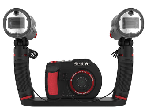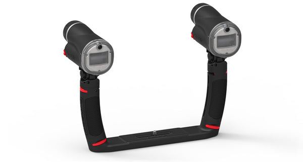 Use the Flex-Connect Dual Tray to mount two flashes or lights to your underwater camera for maximum brightness. Double your brightness, reduce shadowing and increase stability. Mounts all cameras with a standard 1/4-20 tripod mount.