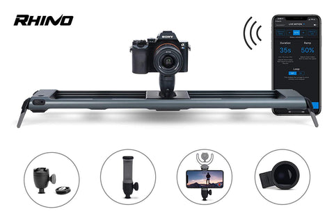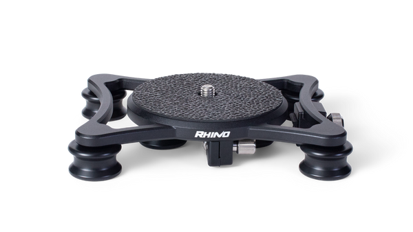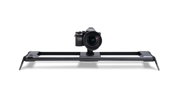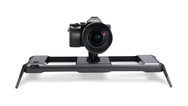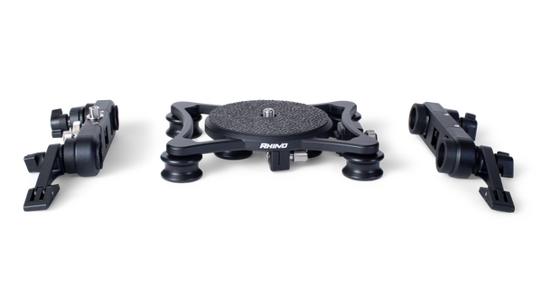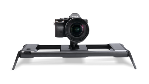 Two dovetail clamps are connected to the base rail. The lower clamp slides along the rail to adjust the position of your camera and lens. The upper clamp acts as a quick release receiver for your camera to quickly connect to the system. The upper clamp can be mounted in one of four positions, allowing your camera or lens to be mounted in a front-to-back or side-to-side motion.