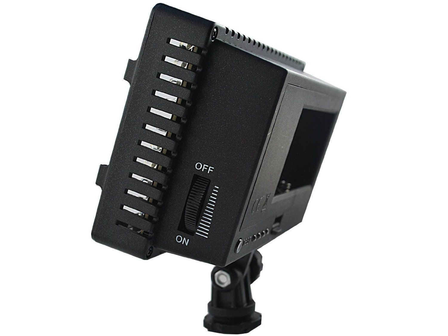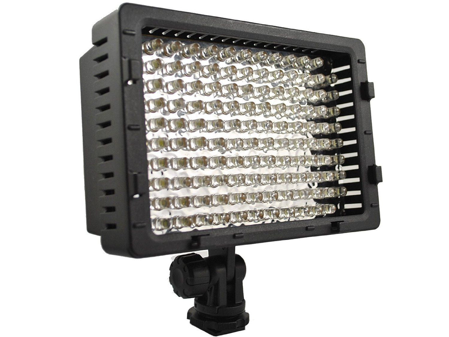 This professional LED light features 126 super bright LEDs with an effective light throw of up to 35 feet. The LED light is dimmable so you can adjust the amount of light you need for each project or setting. The base can be tilted so you can aim the light up or down. You can use many type of Sony NP-F, NP-FH series and Panasonic CGR series batteries to power this LED light. Or you can use 6 AA batteries. This light will run for approximately 2.5 hours on a set of AA batteries. The unit is very light weighting only 8.5 oz without batteries. It has a built in battery meter so you will know how much power it has left. There is a power on-off/dimmable switch to adjust the amount light you need. The unit runs very cool and is safe to touch. Mount on any standard size hot shoe. Come with 3 diffusers. Great for shooting wedding ceremony, reception and many other important events.