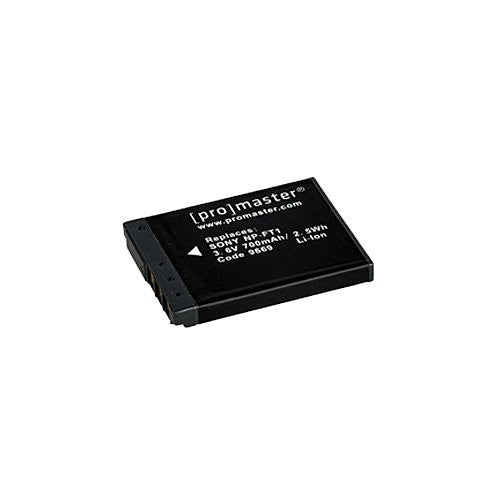 PROMASTER batteries are a high quality, long lasting power source for your digital camera or camcorder. All PROMASTER replacement batteries are manufactured to meet or exceed the equipment manufacturer's specifications. Specifications • 3.6V 700mAH Lithium Ion • Replaces Sony InfoLithium NP-FT-1