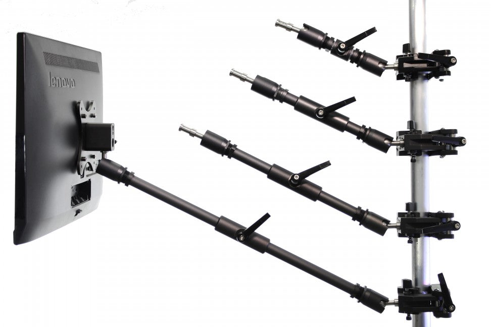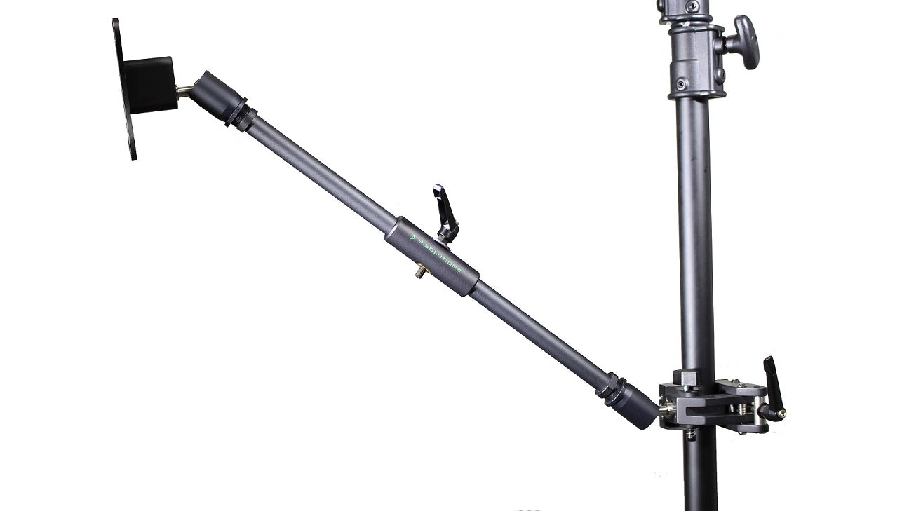 The Double Joint Arm has ball joints on both ends that are locked into position by a single-point tightening mechanism. Each ball joint has a 5/8" pin with a 3/8"-16 female thread, making it easy to mount and position lights, cameras, monitors, or a wide variety of equipment at any angle.