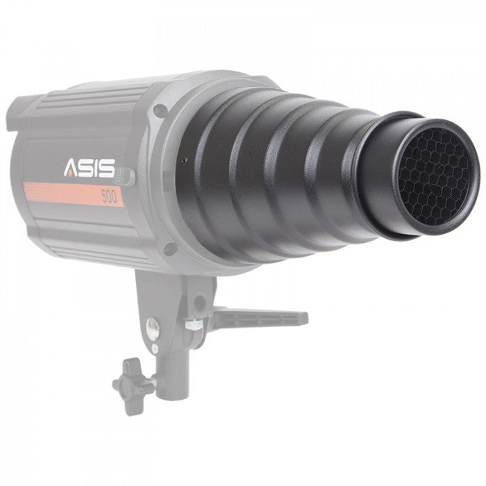 The Asis Snoot is for use with strobes that accept Bowens style light modifiers. The snoot can be used to create a controlled beam of light. The angle of light can be controlled even more with the included honeycomb grid. The snoot also comes with several gels that can add color to the light.