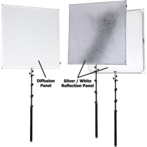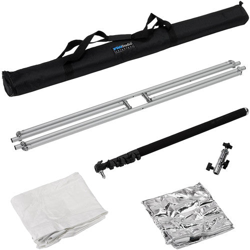 Made to be set up and used by one person, the 4 x 4' Pro Studio Solutions Sun Scrim Collapsible Frame Reflector Kit with Boom Handle and Bag. The kit comes with a 4x4' aluminum frame, a boom handle, 2-stop diffusion panel, silver/white reversible reflective panel, stand/boom frame clip, and a carrying case.