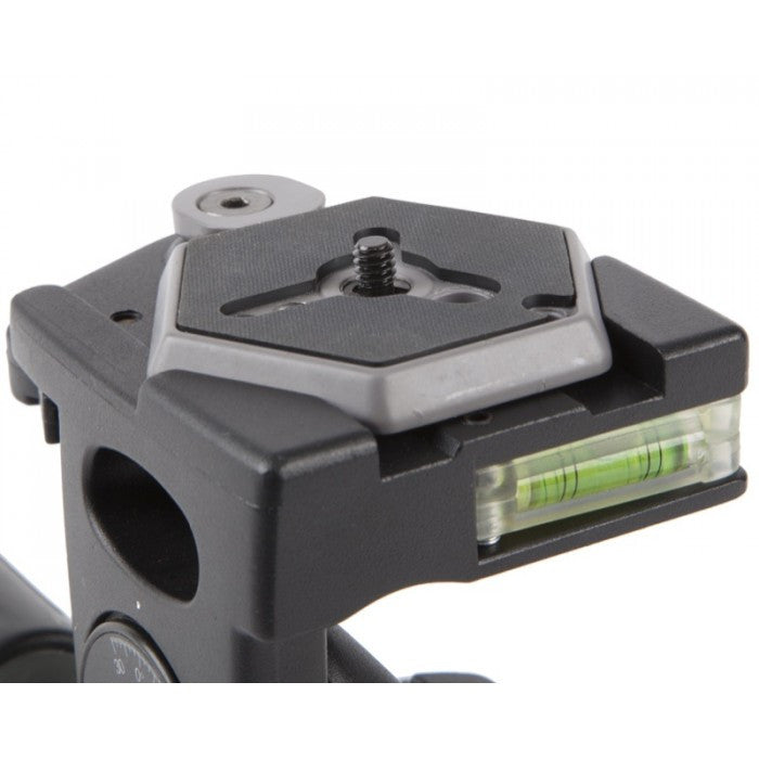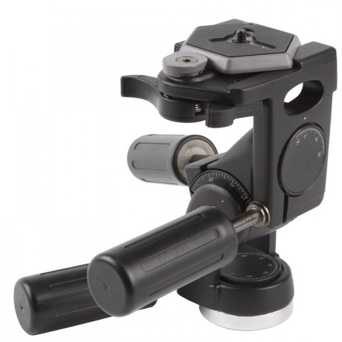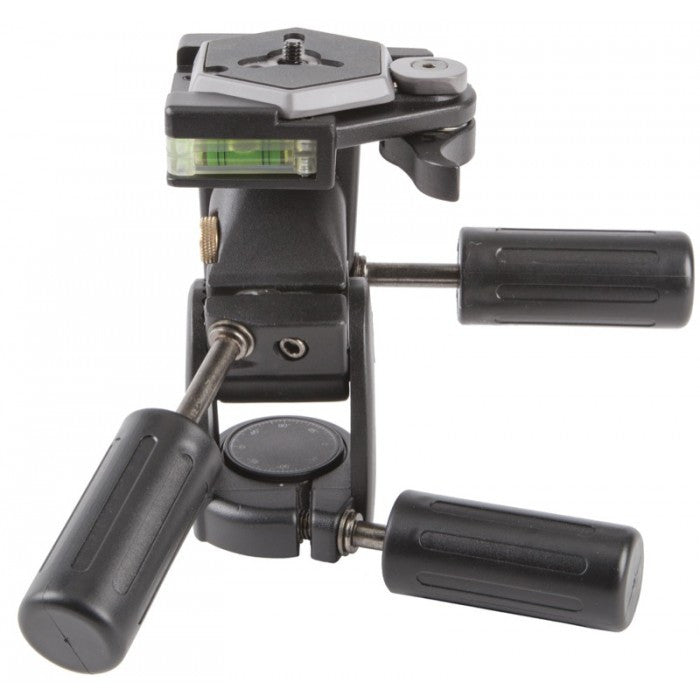 This heavy-duty three-way head is designed specifically for still photographic applications and will handle SLRs, medium format cameras, and view cameras. The maximum load capacity is 23 pounds (10.4 kg). It features individual forward and side tilt locks, and a pan-locking knob for precise camera-placement control. It also offers the convenience of a built-in quick-release adapter that features a safety lock and a spirit level. The included quick-release plate has a 1/4"-20 mount.