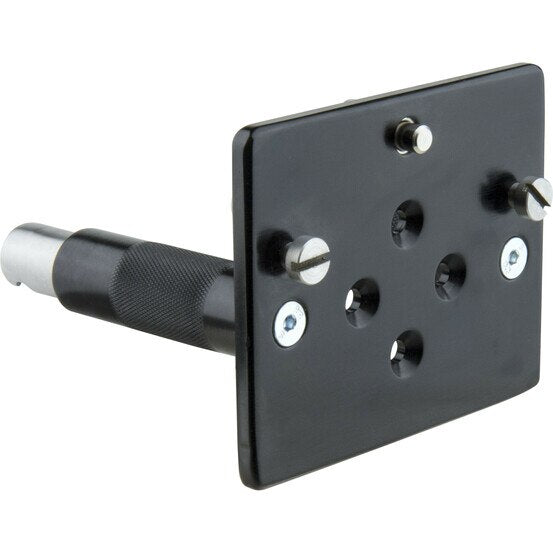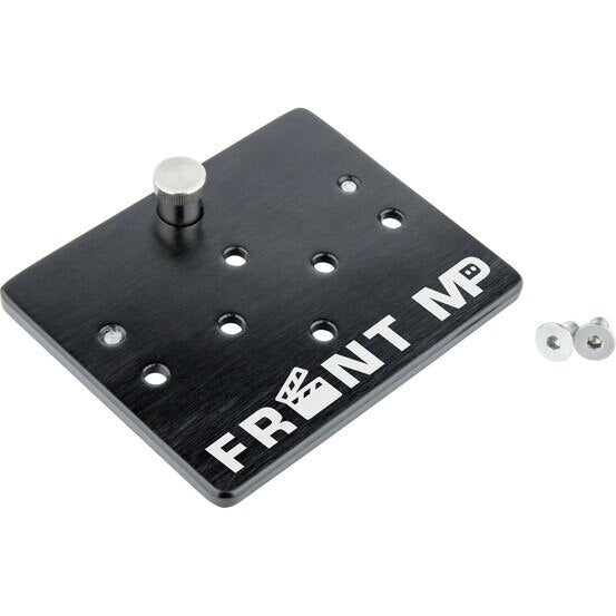 An aluminum plate with a black anodized finish, the Kupo Assistant's Front Box Mount is built for easily mounting the Kupo Front Box to a fluid head. Simply slide the ends of the mount’s two posts onto the head’s front box mounting screws, then turn the black aluminum sleeves clockwise until it is securely locked in place. The fluid head box mount also features a unique spring locking pin that ensures the front box remains securely in place.