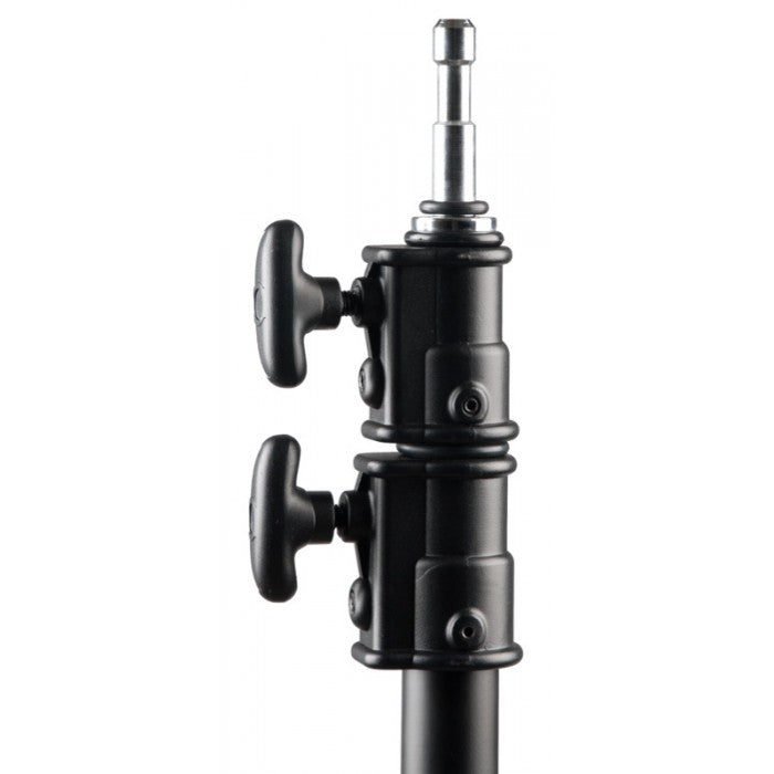 The C-Stand has a maximum height of 131" (333 cm), a minimum height of 50" (127 cm), and weighs 23 pounds (10 kg). The feet feature non-marring plastic ends to protect floors. At the top of the stand is a baby pin that you can attached the included Grip Head to.