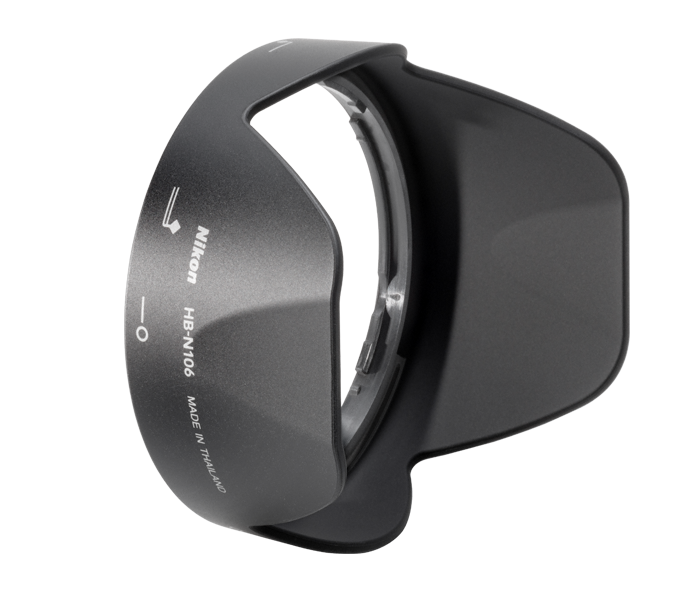 The HB-N106 is an accessory bayonet type black lens hood that attaches to the black 1 NIKKOR 10-100mm f/4.0-5.6 VR lens to protect the lens from flare when shooting.