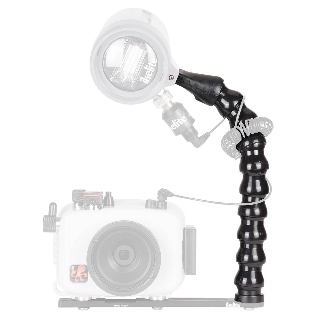 A lightweight and flexible arm for the Action Tray for compact digital housings. The 10" (254mm) long flex arm accepts a DS50 or DS51 strobe. Mounting of larger strobes is not supported. To mount a video light, use product # 4087.26 instead.