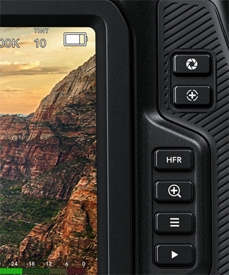 Iris wheel and touchscreen slider for manual iris adjustment on electronically controllable lenses, iris button for instant auto iris settings on compatible lenses.