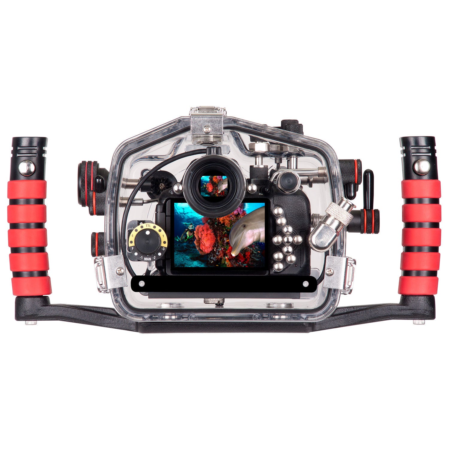 Exposure adjustments directly through the back of the housing put the perfect shot within reach every time. Tweak your TTL exposure or take total manual control without taking your hand off of your housing. Controls on the back of the housing acts as a remote control for compatible Ikelite DS-series strobes. Access plus/minus exposure compensation in TTL mode, plus manual power settings in half-stop increments.