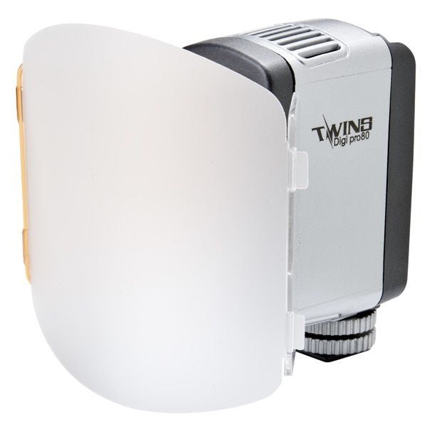 The Twins Digi Pro80D LED Video Light has two swing-away filters: one (1) Tungsten and (1) Diffusion. The swing-away filters make it easy to either soften your light or change its color temperature to 3200K (Tungsten).