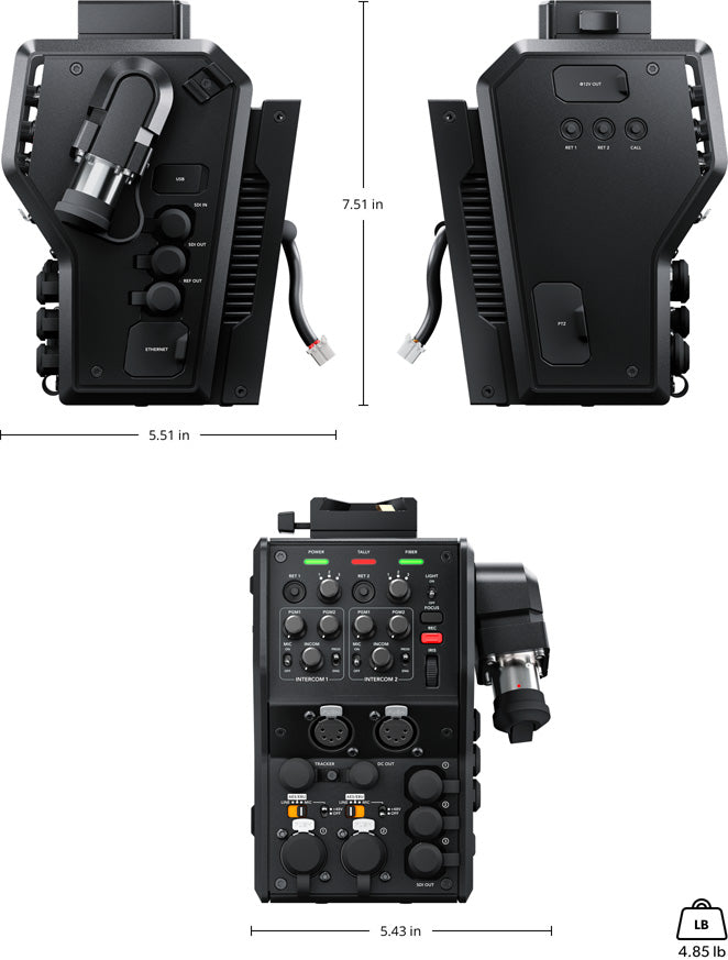 The Blackmagic Camera Fiber Converter lets you extend and power your URSA Broadcast from up to 2 km away using industry standard SMPTE fiber cables. It also includes common live camera controls with multiple channels of talkback and standard television industry talkback headset connections. The Blackmagic Camera Fiber Converter features 1 Ultra HD camera feed, plus 3 HD return feeds in a compact IP video based design.