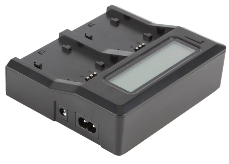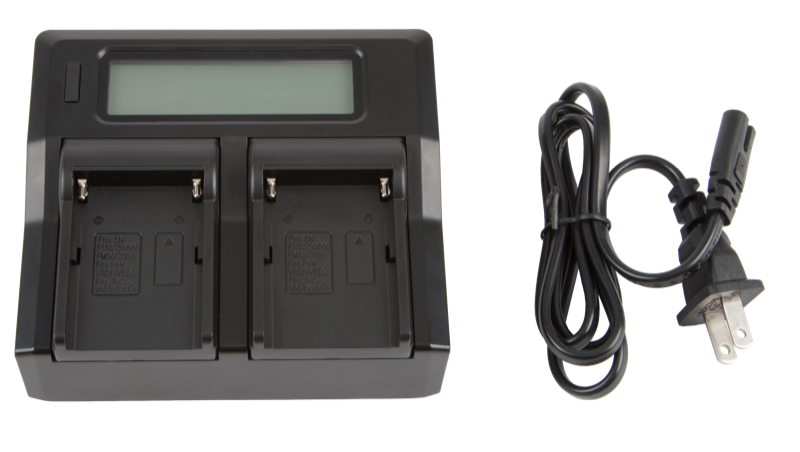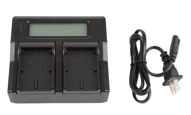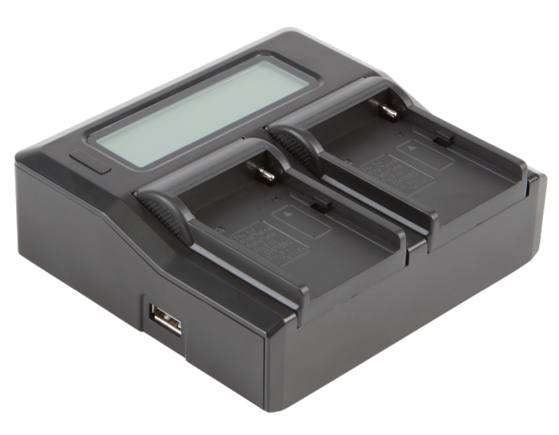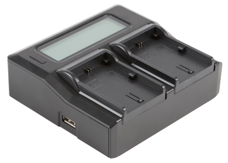 The charger comes with two Sony NP-F style interchangeable battery plates. Additional plates that support other batteries can be purchase separately making this charger a perfect solution for charging many types of li-ion batteries for both video cameras and DSLRs. The unit also has a USB input on its side, so you can charge a mobile device at the same time.